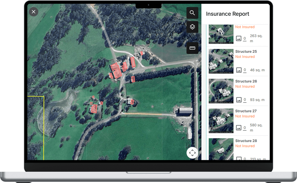 DAS automatically detects all structures within property boundaries, ensuring nothing is missed. Capture every asset to eliminate underinsurance, save time on site visits, support accurate premium allocation, and enable real-time quoting with audit-ready documentation.